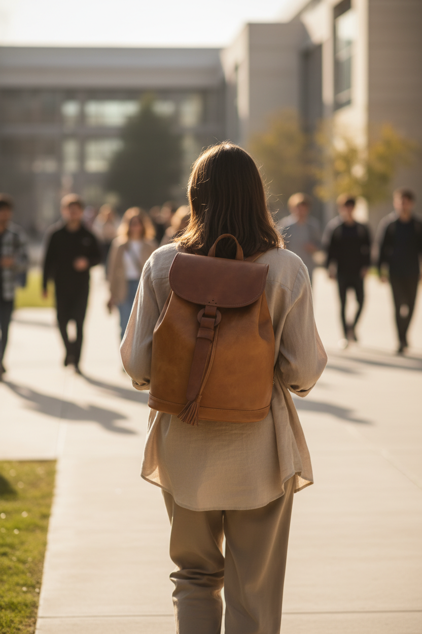 • Spacious interior → fits laptop, journals, and daily essentials with ease.